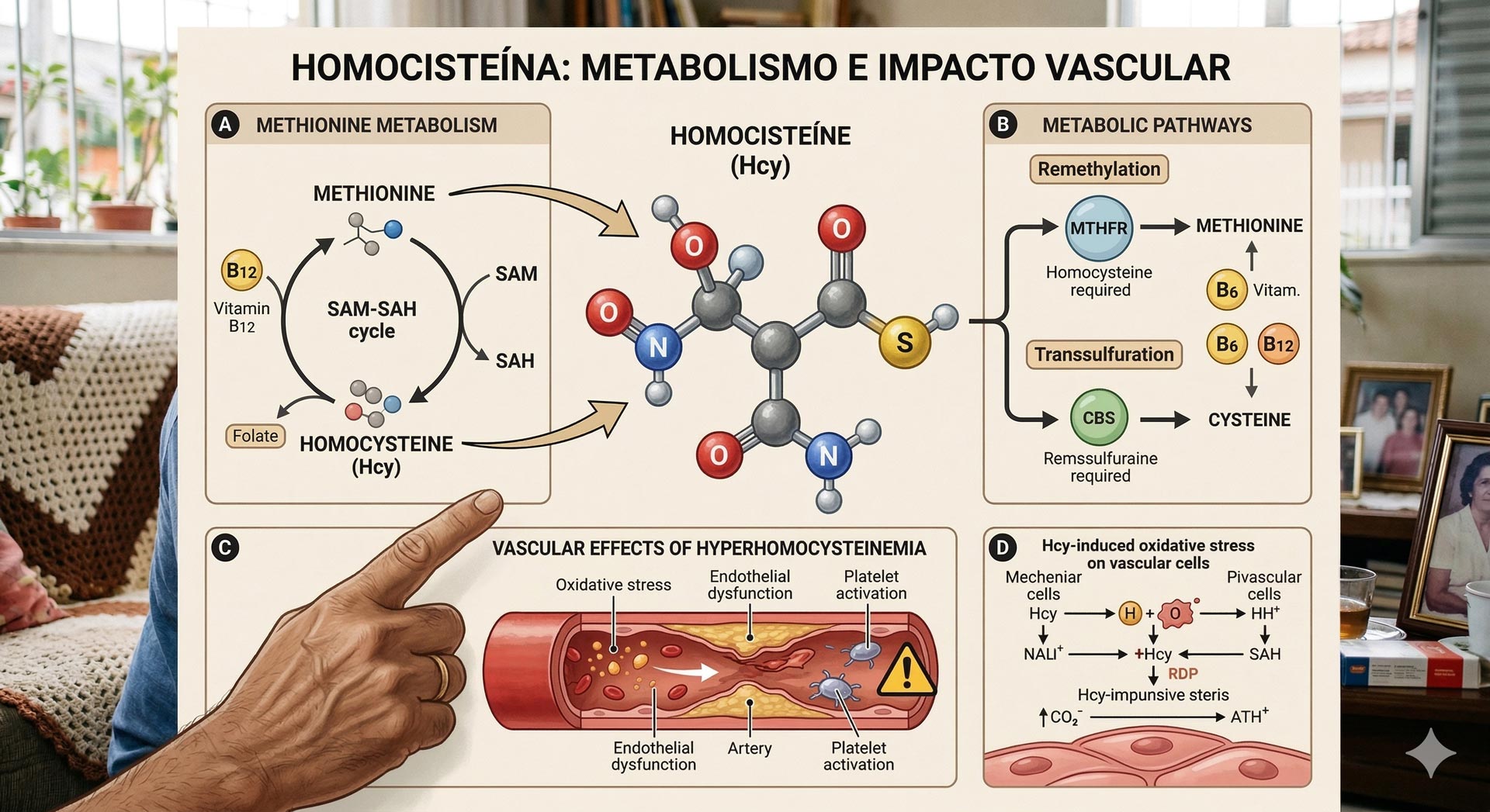 Quando esse equilíbrio falha, os níveis sanguíneos de homocisteína podem se elevar — fenômeno chamado hiper-homocisteinemia — que tem sido associado a alterações vasculares, metabólicas e neurológicas.